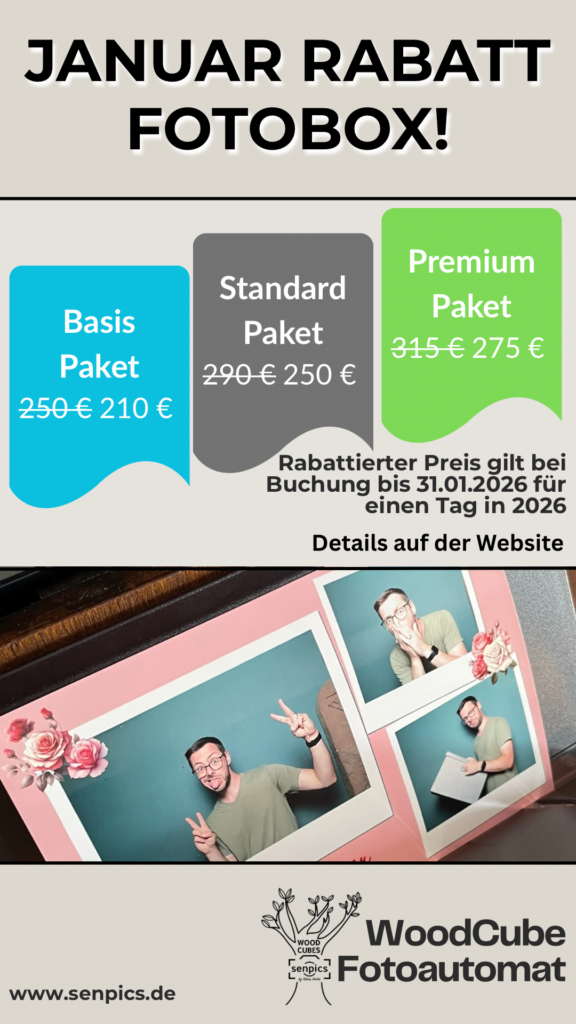Hier bekommst du einen edel aussehenden Fotoautomaten in Holzoptik, der dem Abdruck „Fotoautomat“ gerecht wird. Eine digitale Spiegelreflexkamera kombiniert mit einem Studioblitz machen super Fotos, die dann direkt auf einem professionellen Fotodrucker ausgedruckt werden können.